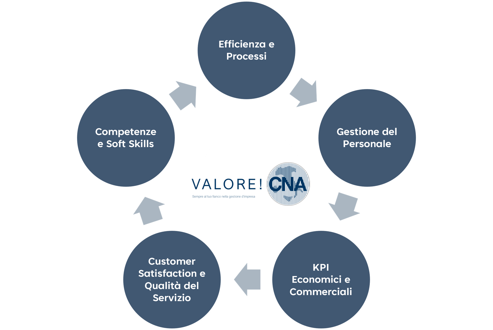 Un percorso di consulenza, ad oggi unico a livello nazionale che agisce su 5 Aree Strategiche fondamentali per la crescita: processi, persone, clienti, numeri e competenze.